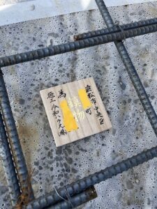 基礎工事中に毎回行っているのは工事の検査と鎮め物の埋設です。