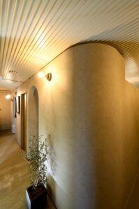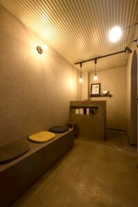 ガルバリウム鋼板の天井とモールテックスとアイアンのコンビが非常にカッコいいです。