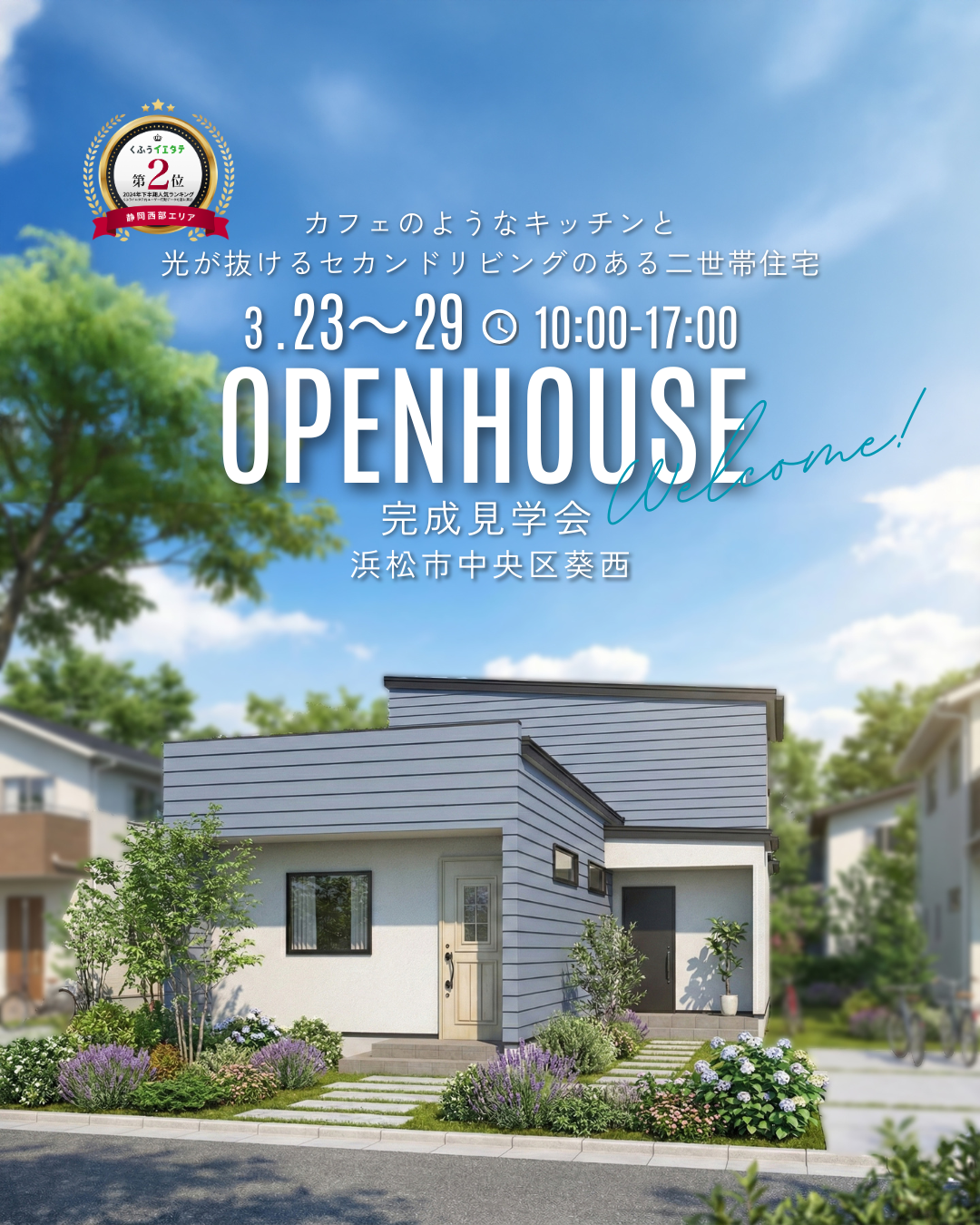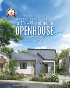 3月の内覧会! スタッフブログ X Facebook はてブ Pocket LINE コピー 2026.03.05 スタッフブログ 第2弾!!カフェのような素敵な住まいが完成しました!! 3月23日から1週間完全予約制で建物内覧会をさせて頂きます!! こんな住まいに住みたい!と思わず言ってしまいそうな素敵な住まいが完成しました。 駐車場の関係で今回は予約された方しかご覧いただけませんが期間を1週間とらせていただきましたので住まいをご検討の方には是非ご覧いただきたい建物です! ナチュラルで明るい住まい。敷地を上手に使った間取りですので参考になる場所がたくさんありますね。 【ご予約】053-401-3636